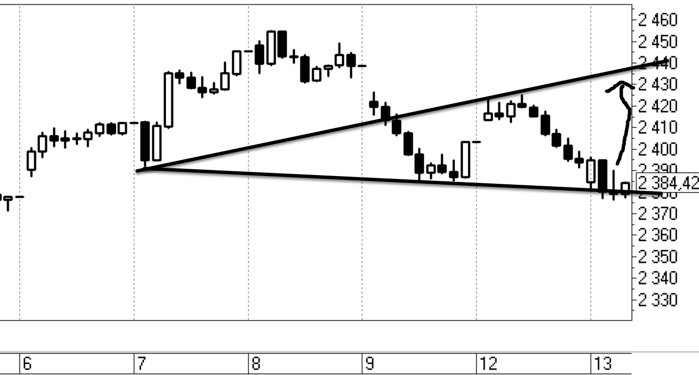 Уровень слома Вульфа находится ниже 2360, в случае если отработки не будет, а будет слом на рынке возможна краткосрочная паника, поскольку на 2380 многие попытаются купить рынок.