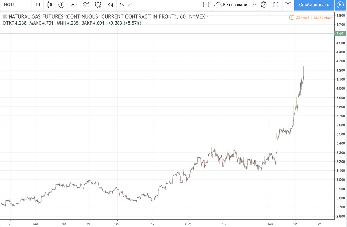 Сквиз по натуральному газу в США. натуральный газ в США сквизит 15% росту за день и с сентября с 2,8 до 4,7 сделал ходку: газ 14.11.18 19:27 6731 GusevSergey +6 5 комментариев ВолшебныйКонь 14.11.18 19:56 # ↓ до 15 могут разогнать Krechetov 14.11.18 19:59 # ↑ ↓ +3 Вот только спотовым ценам в европе всегда было пофигу чего там в сша на споте газа ВолшебныйКонь 14.11.18 19:57 # ↓ трамп лонгует и пирамидится ) vfadeev 14.11.18 20:55 # ↓ Интересно, а наши газодобытчики (новатэк, ГП) не могут им в стакан продать фьючерсов на газ, и расплатиться потом поставкой сжиженного газа к дате экспирации. Для Новатэка вполне себе вариант зафиксировать дополнительную прибыль… Или низя, санкции? Trump Tower 14.11.18 21:09 # ↓ какой же там дубак в США что так шатануло с 2,8 до 4,99$?