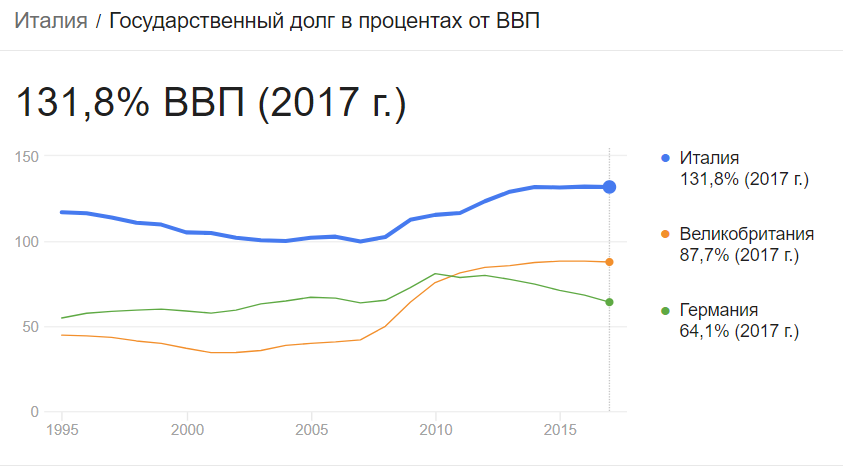 Италия занимает второе место в ЕС после Греции по величине гос. долга по отношению к ВВП, этот показатель в стране составляет 131,2%.