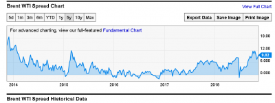 Давно мы не смотрели отношение нефти Brent к нефти WTI. А тем временем график отношения этих сортов нефти пробил хаи года. Посмотрим на график:
