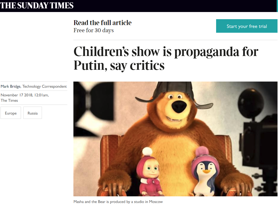 Да вы не ошиблись. Агентами влияния Кремля в Британии решили считать "Машу и Медведя". Мульт сериал по мнению "британских экспертов" является частью пропаганды Кремля за рубежом.