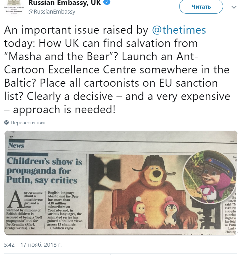 Вчера на подобные статьи в британской прессе ответило Российское посольство в Великобритании. Вот их ответ:
