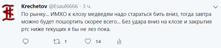 Пока рынок на мой взгляд полностью остаётся в медвежьей логике. Хотя и не без напрягающих моментов которые описывал в недельном обзоре.