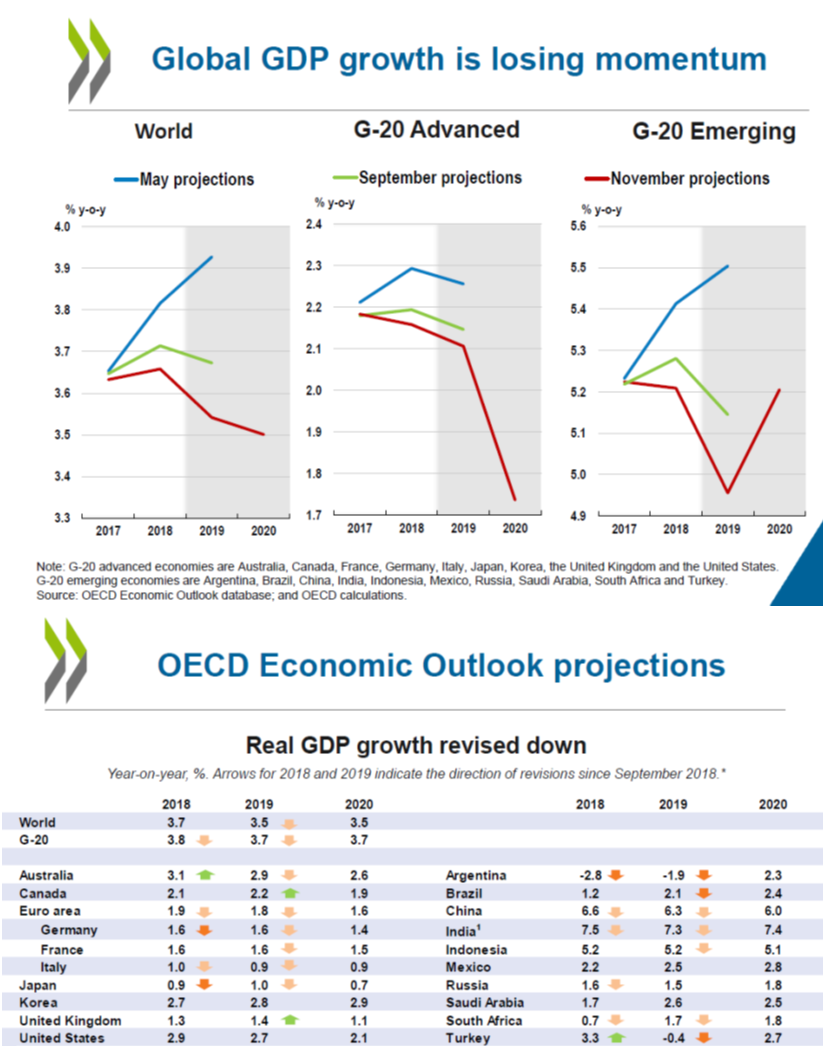 В сегодняшнем докладе OECD прогноз по мировой экономике был пересмотрен в сторону ухудшения (см. картинку). Как можно было ожидать, сильной и немедленной реакции не случилось. Во-первых, OECD это международная организация, и режим секретности там можно оценить как "никакой". Уверен, все серьезные люди знали содержание доклада задолго до. Во-вторых, все ждали американской статистики. Тем не менее, DAX отыграл с 11180 в 11:05 СЕТ до 11120 в 11:40.