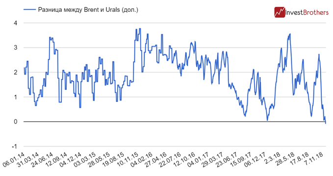 Если за октябрь-ноябрь котировки Brent потеряли 30%, то Urals 28,2%. За это же время испарился веь дисконт, который был равен 2-2,5 долларам.