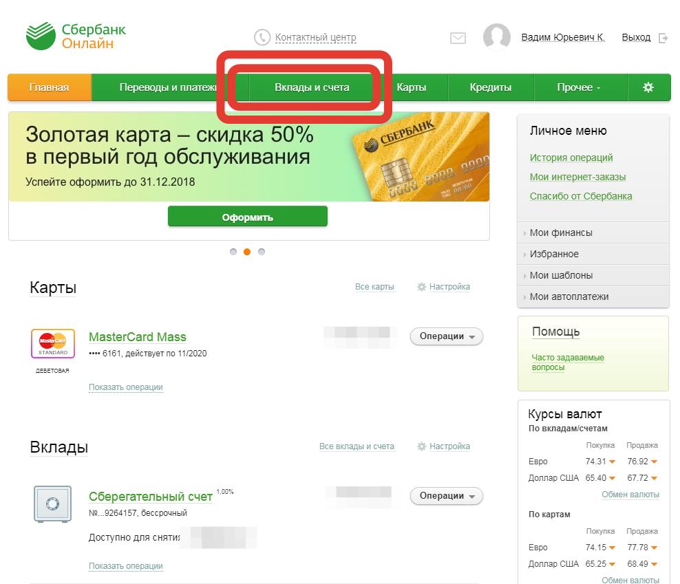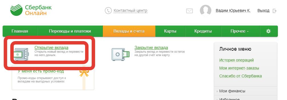 2. Открыв на компьютере сайт Сбербанка и войдя со своим логином и паролем в Сбербанк Онлайн(далее СО), вам необходимо первым делом открыть долларовый вклад, перейдя в нужный раздел: