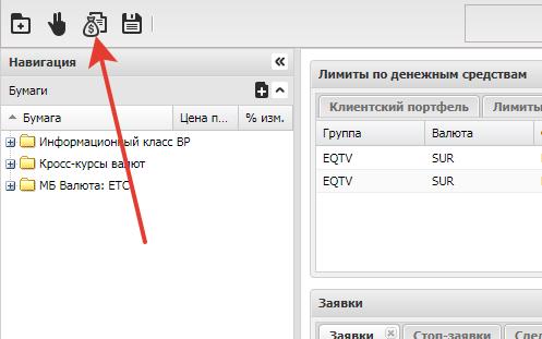 Вошли в квик и создаем заявку на покупку, убедившись что деньги находятся на нашем счете во вкладке "лимиты по денежным средствам":