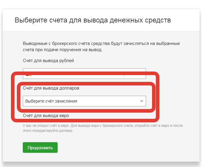 Не забывайте указать счет, открытый ранее, на который будете доллары выводить!