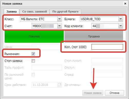 Заполняем все выделенные поля, не забывая, что в одном лоте 1000 долларов: