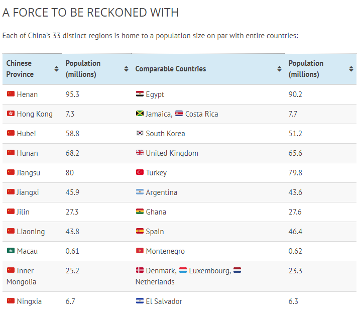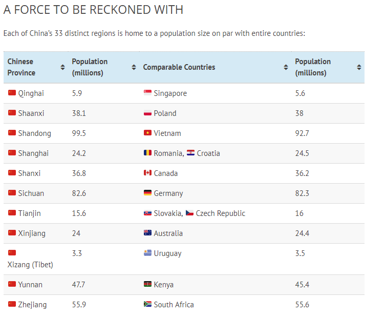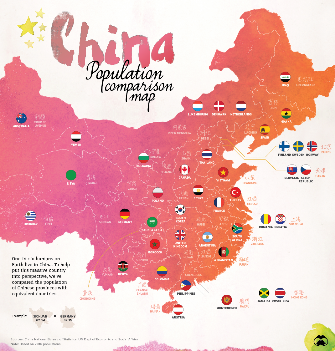 На данной карте Китая отдельные китайские провинции сопоставимые по численности населения с отдельными странами мира помечены флажками этих стран: