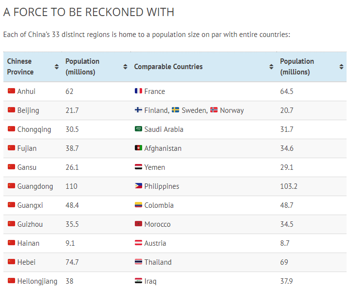 Здесь видим, что отдельные провинции Китая превосходят по населению например любую ил стран ЕС.