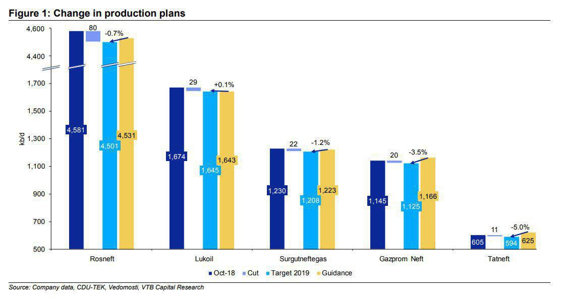 А это как российских нефтяников коснётся сокращение добычи. Производство в 2019 снизится у всех по отношению к 2018, но у Лукойла и Роснефти практически совпадёт с гайдансом: