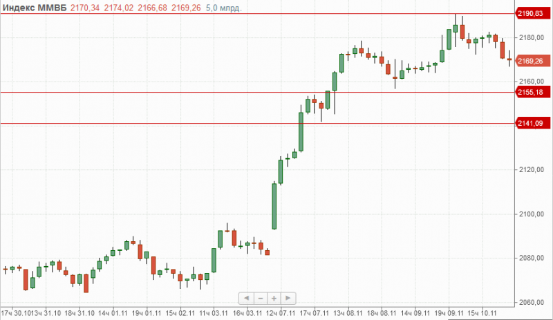 Индекс ММВБ на прошедшей торговой сессии снизился на 0,66%, закрывшись на отметке 2169п. Поддержкой в текущей ситуации выступает 2155п., при закреплении под которой первая цель снижения находится в районе 2141п. Сопротивлением на данный момент служит отметка 2195п.