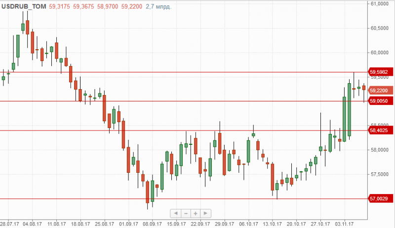 На прошедшей торговой сессии рубль продолжил находиться в узком диапазоне 59,60-59, где локальной поддержкой выступает отметка 58.60, проход которой может вернуть инструмент в диапазон 58,40-57.