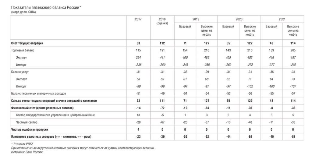 При $55/барр приток валюты по счету текущих операций оценивается в $71 млрд,отток по финансовому счёту (гашение внешних долгов, выход нерезов, спрос на внешние активы и тп) - $19 млрд, рост резервов (покупка валюты ЦБ по бюджетному правилу + докупка части за 2018 г.)- $52 млрд.