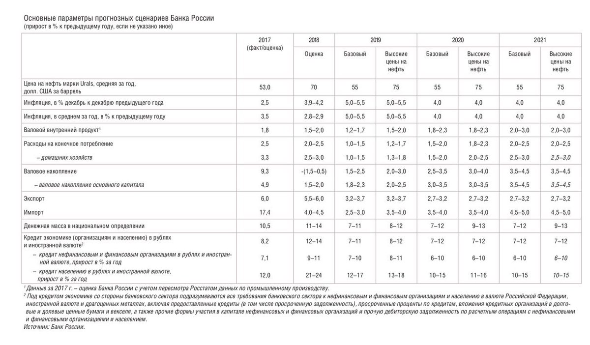 Новый макропрогноз ЦБ РФ. Базовый сценарий - $55/барр. Сценарий с высокими ценами на нефть - $75/барр. При обоих сценариях инфляция на конец 2019 - 5-5,5%.