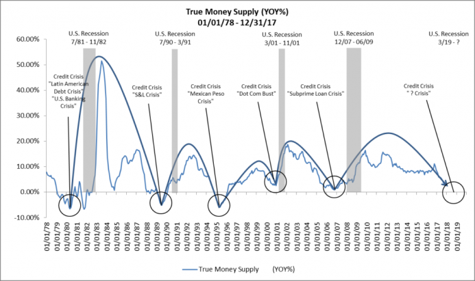 На фоне сокращения баланса ФРС денежная масса практически перестала расти. Традиционно это происходило немного загодя финансовых кризисов в стране.