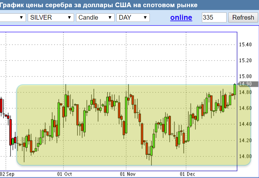 Итак, внимательно смотрим. В этом боковике серебро болталось больше 3 месяцев. Сегодня похоже на то, что оно попытается выйти из него как и ожидалось вверх. Выход на 15 фактически будет являться пробоем диапазона. Если он сосотоится то целям ибудет выход в диапазон 15,5-16 и он должен быть достаточно быстрым, ведь консолидировались несколько месяцев.