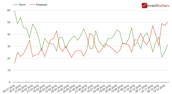 Согласно опросу AAII, ко вчерашнему торговому дню более половины всех респондентов являлось «медведями». Впервые за нынешний год доля тех, кто ждет падения рынков достигла 50,3%, увеличившись за неделю на 3 процентных пункта.
