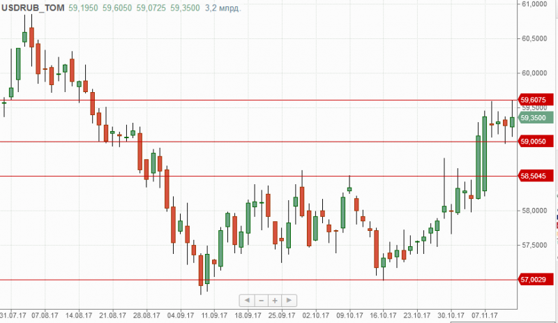 Рубль четвертую сессию подряд проводит торги в узком диапазоне 59,60-59, где локальной поддержкой выступает отметка 58.50, проход которой даст шансы на возвращение инструмента в диапазон 58,40-57.