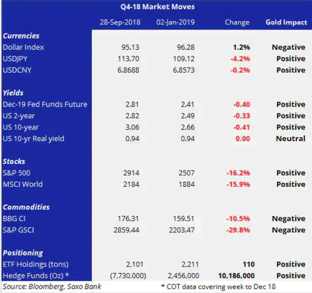 При этом последний квартал 2018 года оказался благоприятным для драгоценных металлов. По мнению аналитиков Саксо Банка это было вызвано ухудшением перспектив экономики США и как следствие предположение рынков о том, что ФРС не будет ужесточать политику теми темпами, которые предполагались ранее.