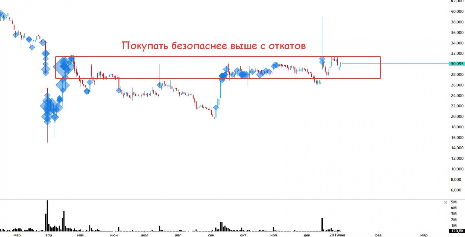 По объёму даже без кластеров видно как кто-то загружался в акцию несколько раз и с тех пор мы растем!