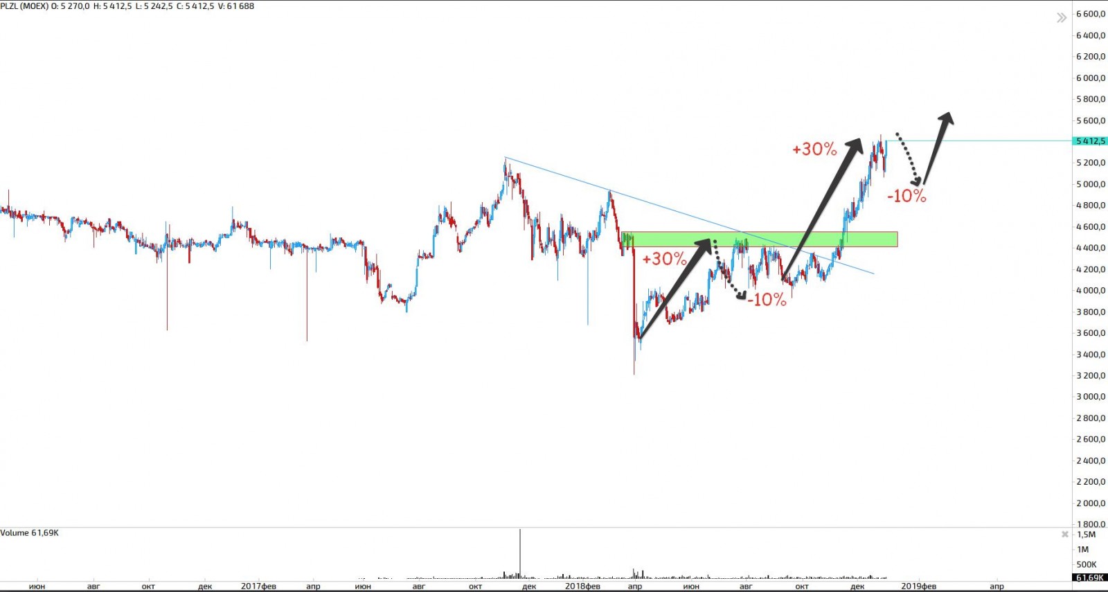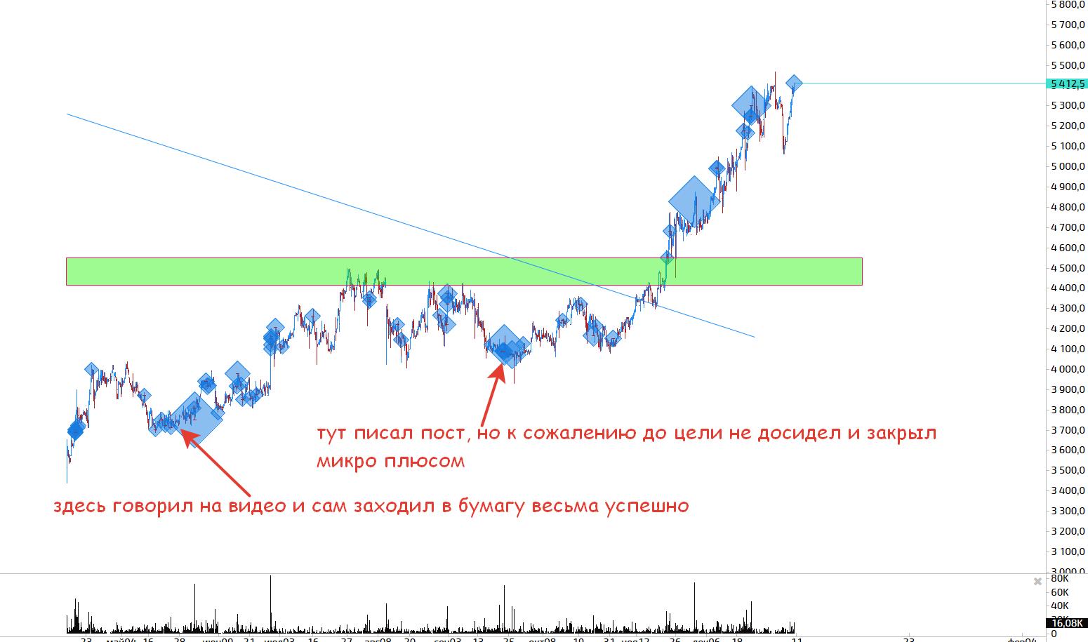 Первым будет полюс, бумага, которая закладывала позитив еще в мае, но я сам не поверил в то, что мы обновим исторические хаи так скоро, пробив перед этим без нормального теста уровень смены приоритета 4500-4600! Сейчас логично ждать коррекции 8-10% для покупок! Картина выглядит следующим образом: