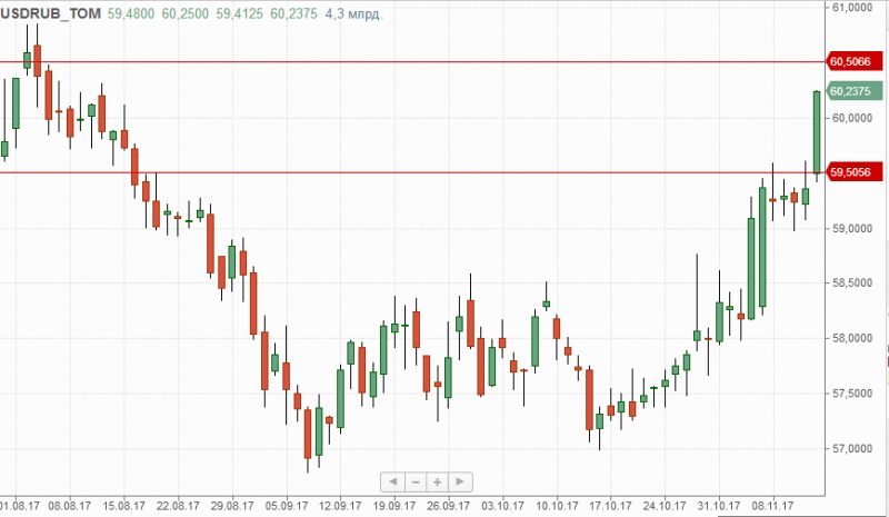 В настоящий момент рубль имеет все шансы протестировать отметки 60,50 и 61. Локальной поддержкой в текущей ситуации выступает 59,5.