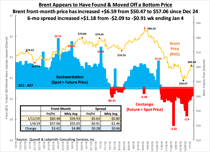 Форвардная кривая Брента находится в слабом контанго до августа 2019 года. 6-ти месячный спред увеличился увеличился на 0,28$: