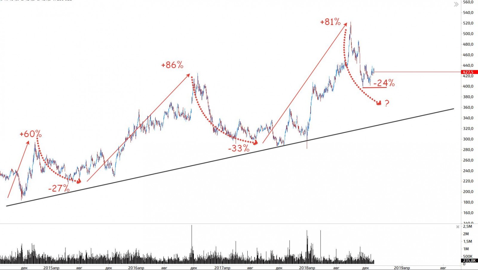 Акция находится близко к пределам своего возможного роста исходя из волатильности прошлых волн: