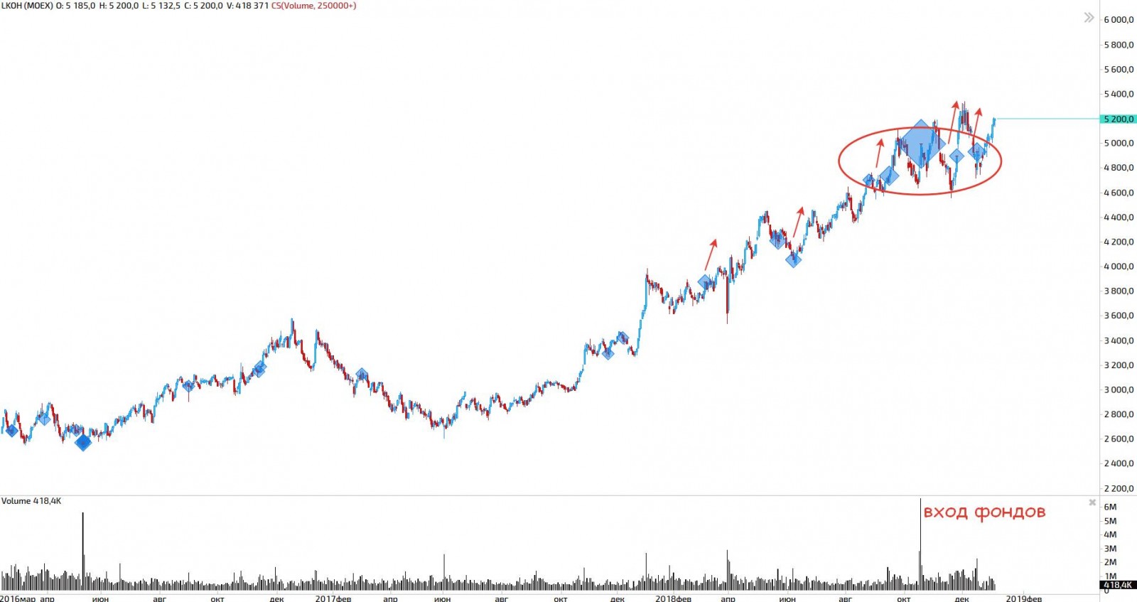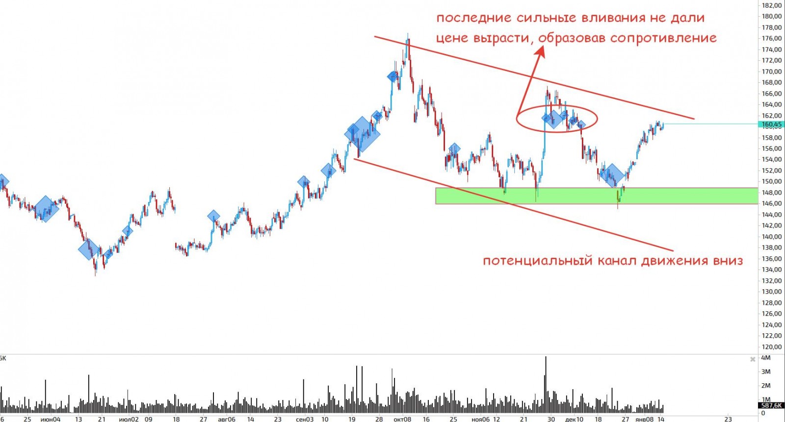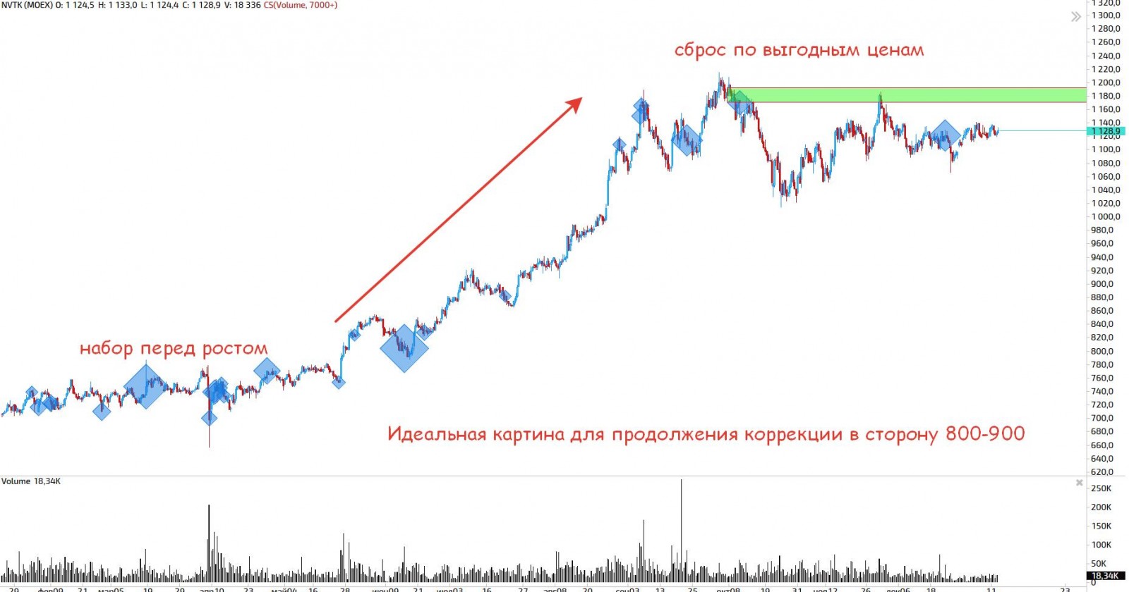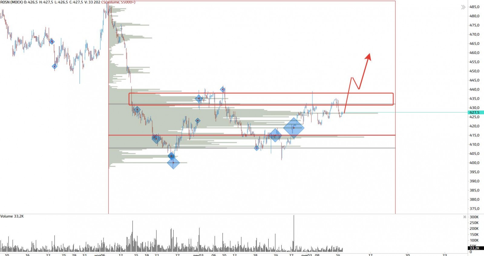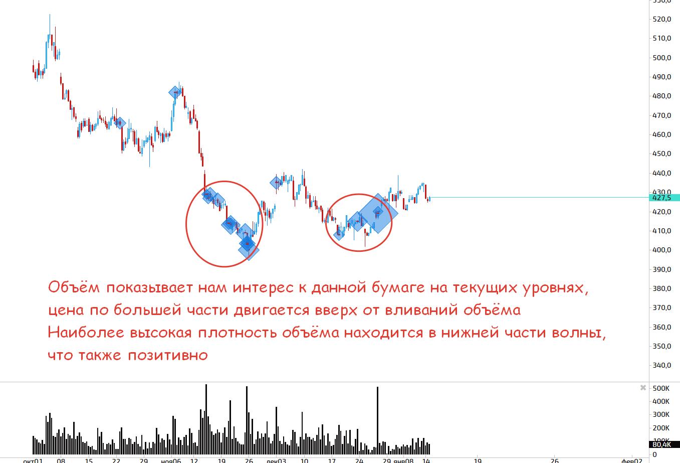 В такой ситуации шорт наравне с лонгом становится неплохим спекулятивным вариантом, вовремя открытый шорт даже может стать очень не плохой среднесрочной идеей, но пока рано! При поиске крупных объёмов мы можем видеть, что начинается фиксация позиций, но пока это не приводит к существенному снижению спроса на акцию, по большей части после вливания объёма акция продолжает расти: