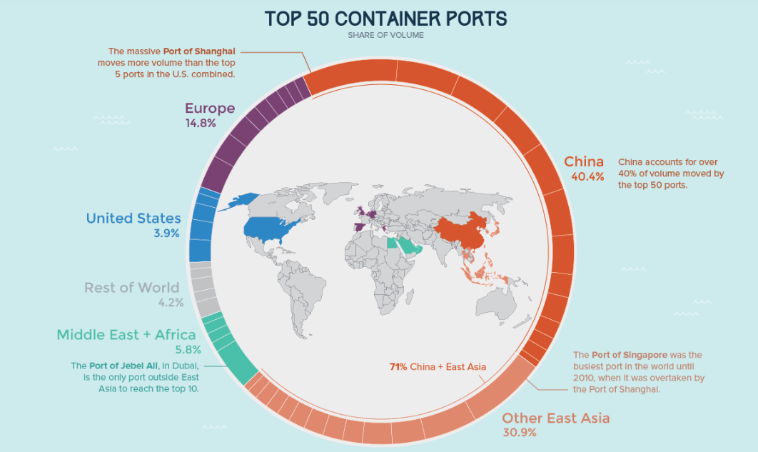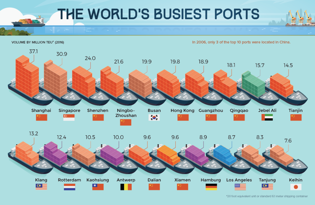 В данной инфографике представлены крупнейшие порты мира по товарообороту: