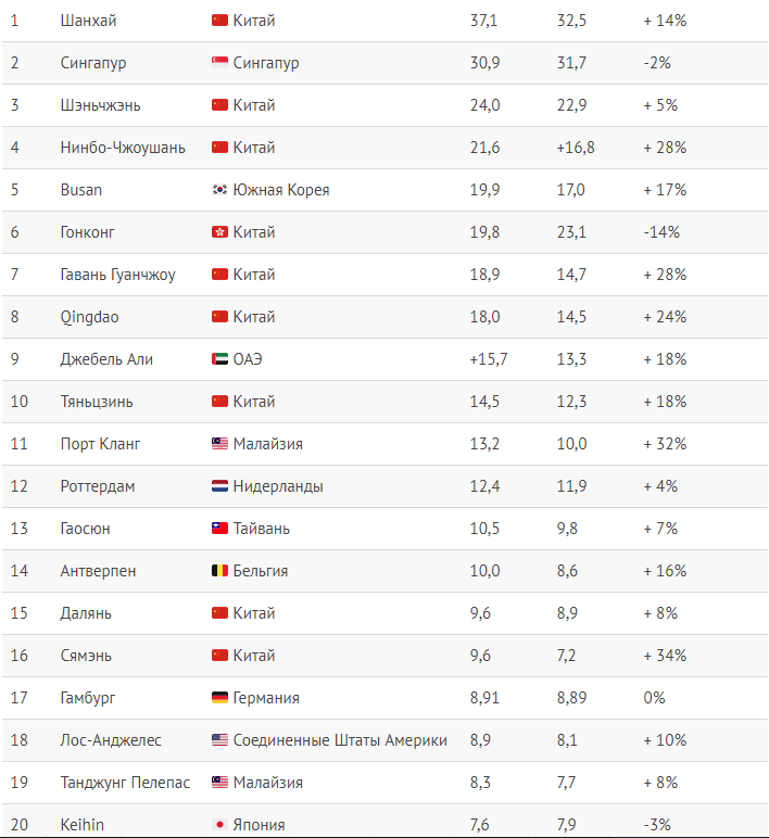 В глаза бросается засилие китайских портов ТОПе и это не удивительно учитывая что 40% товарооборота 50-ти крупнейших портов мира приходится на Китай: