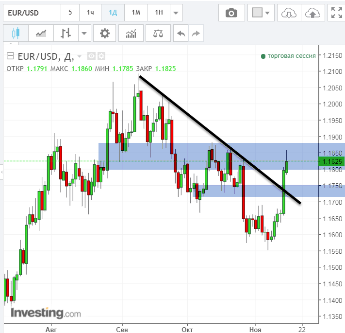 Технические моменты. Евро. Пробой тренда. Вероятен откат.