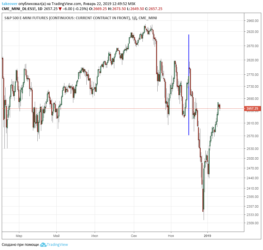 Итак, 30.11.2018 умирает Дж.Буш старший. В этот же день начинается саммит G-20 в Буэнос-Айресе. Все начинают говорить о прорывных договоренностях, ни одна из которых не подтвердилась и по сей день. А что по факту? А по факту в понедельник SnPпоказывает локальный максимум и резко разворачивается вниз. Золото же наоборот начинает резкое движение вверх.