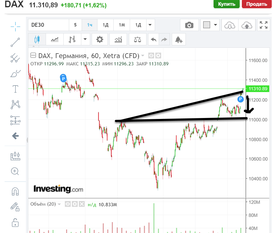 Сегодня интересная ситуация с такой же волной вульф сложилась в немецком индексе Dax.