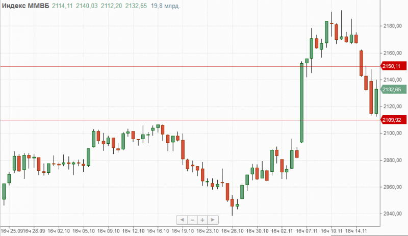 Индекс ММВБ на прошедшей торговой сессии после теста поддержки расположенной в районе 2110п. закрылся на положительной территории и на данный момент для продолжения роста индикатору нужно закрепляться над отметкой 2150п.