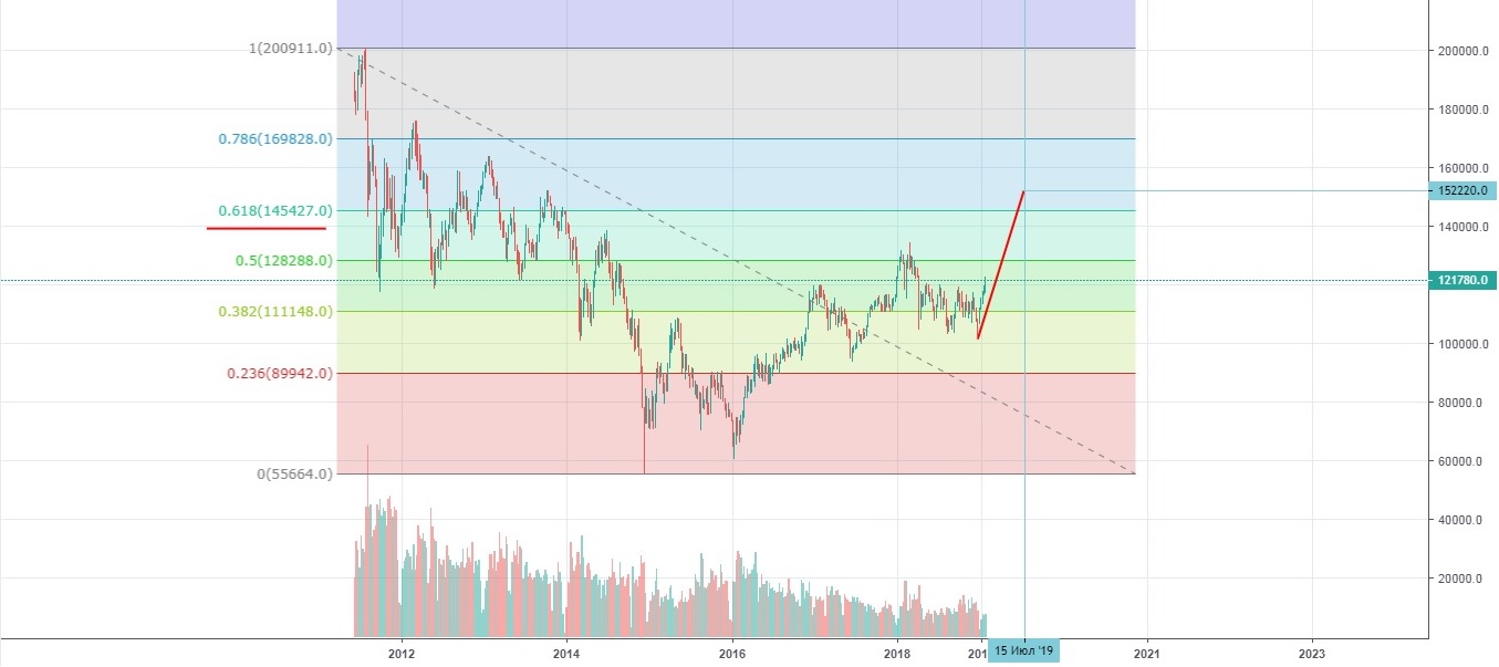 Интересно, что цель точки 5 находится около уровня 61,8 по Фибо от всей волны падения с августа 2011 года по декабрь 2014 года.