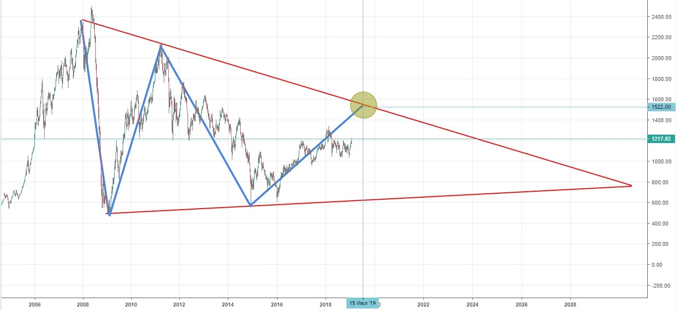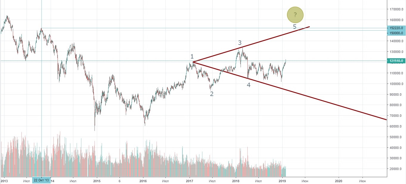 Повторюсь, утверждать, что будет именно так, я не буду, но на текущий момент времени считаю, что у данного Вульфа есть все шансы стать ключевой формацией этого года (движение из точки 5 в точку 6 – потенциально может быть тем самым кризисом, которого все так ждут + это движение было бы пятой (последней) волной того самого треугольника). Но это лишь мое ИМХО.