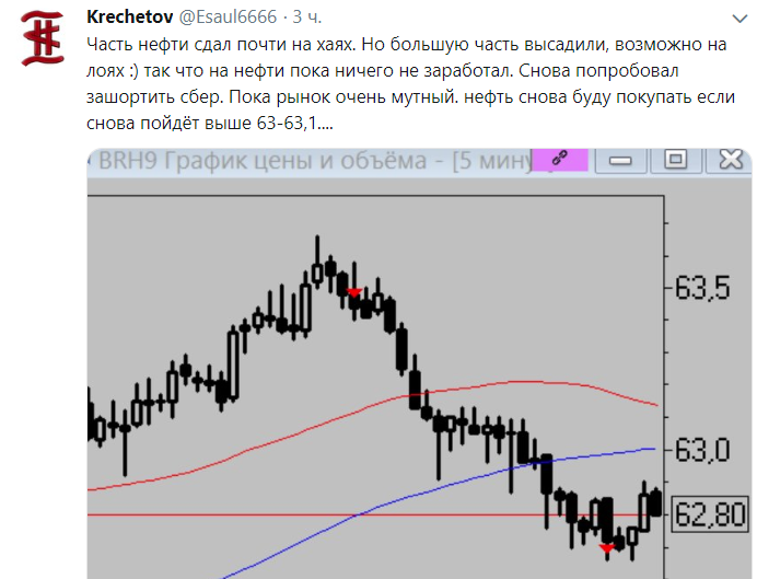 С утра лонговал нефть по 63. 1% профита в итоге не забрал вышел в ноль. О выходе скидывал в твиттере: