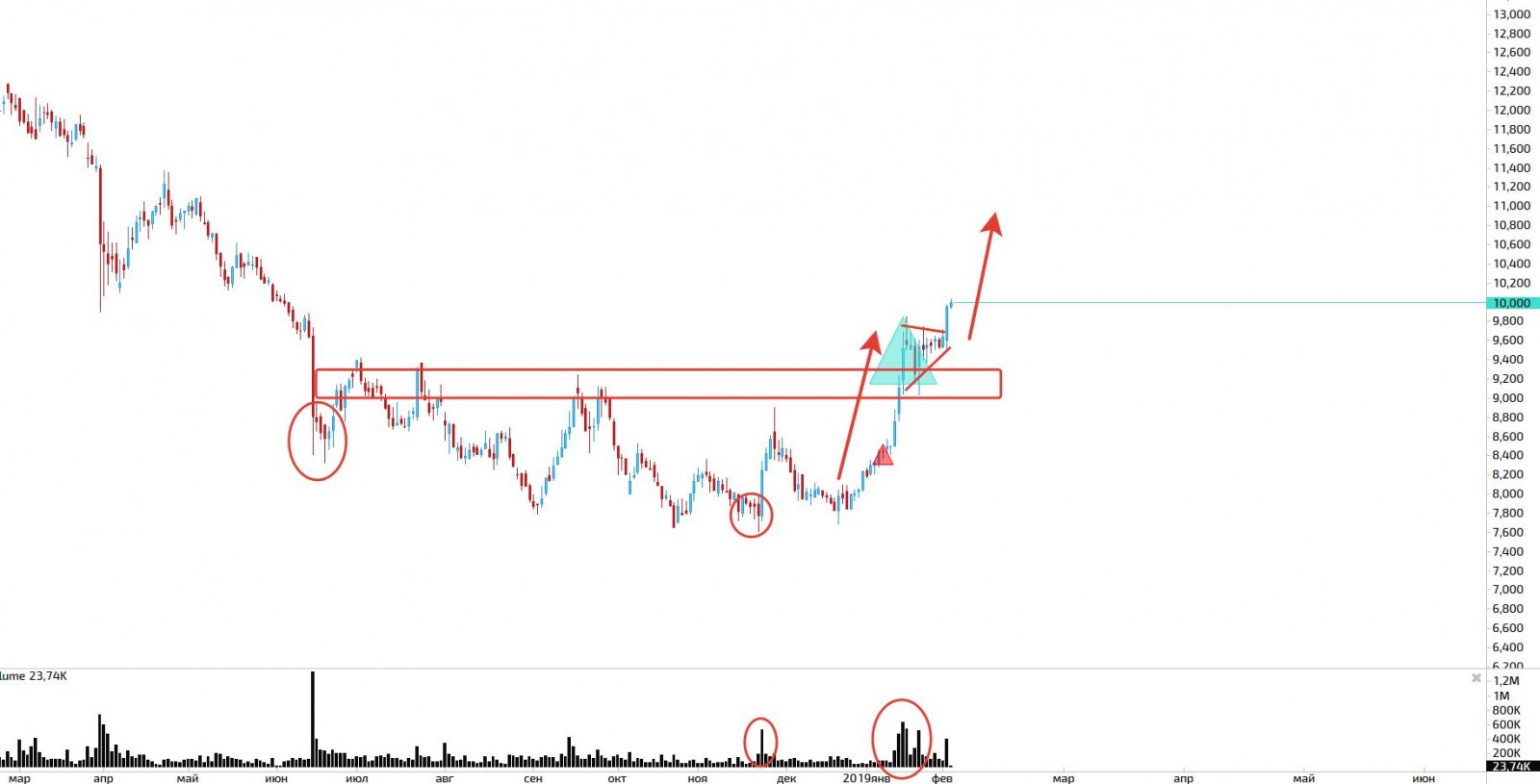 Система, очень хорошо себя проявляет, делаю ставку на эту бумагу на пару со Сбербанком, многие бумаги что покупал в январе и конце того года я уже скинул, систему купил и собираюсь держать дольше прочих, постепенно доливаясь по движению. Цена показывает все возможные сигналы к высокому спросу на эту акцию: