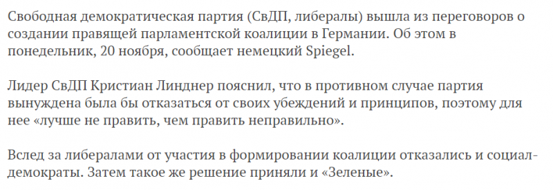 А вот это уже интересная новость. В моменте данная новость надавила на евро и возможно надавит на фондовые рынки. Более подробно возможно буду разбирать в видео, когда ситуация станет пояснее. Но если будут перевыборы и Меркель всё таки не станет канцлером для России это может иметь довольно таки значительные последствия как в экономическом так и в геополитическом плане.