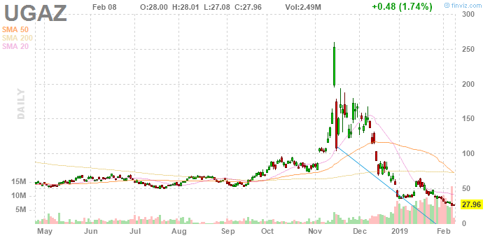 Сильный рост газа, начавшийся с сентября 2018г. по декабрь 2018 похоже пришел на то место откуда он стартовал. С учетом завершения холодного сезона в США, с текущих значений сходить опять намного выше не получится. Более того, даже аномальные Т показатели в Чикаго и Нью-Йорке долго держать цену на газ выше 3$ смогут. Впереди долгие месяцы аккумуляции. По технике уровень 2.53$ остается основной преградой для дальнейшего снижения стоимости природного газа до уровня 1.9-1.6$ MBTU. Лонговый ETF на природный газ ушел очень сильно вниз с исторических хаев в 260 $ на 27$ (почти в 10 раз). Разворота пока нет. Тенденция по снижению стоимости остается в силе, возможны краткосрочные задерги в сторону 2.8-3$ (short zone) при условии резкого похолодания в северной части США.