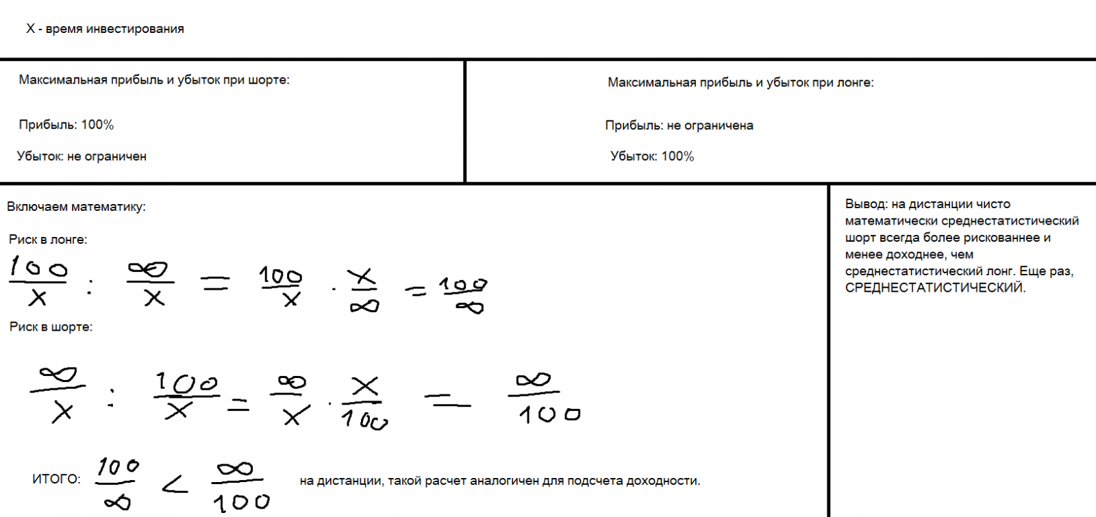 Шорт — обратная ситуация; т.к. рынки могу расти долго и уверенно, наш убыток может расти бесконечно. А максимальная приыбль — это стоимость акции, то есть 100%. Было одном трейдерском форуме где-то интересное мнение, что все крупные биржевые капиталы сколачивались на шорте, т.к. рынок падает быстрее, чем растет. Частично я с этим согласен, но стоит учесть, что на шорте разорилось больше инвесторов, чем на лонге, а в статистику попали только кому рынок дал.