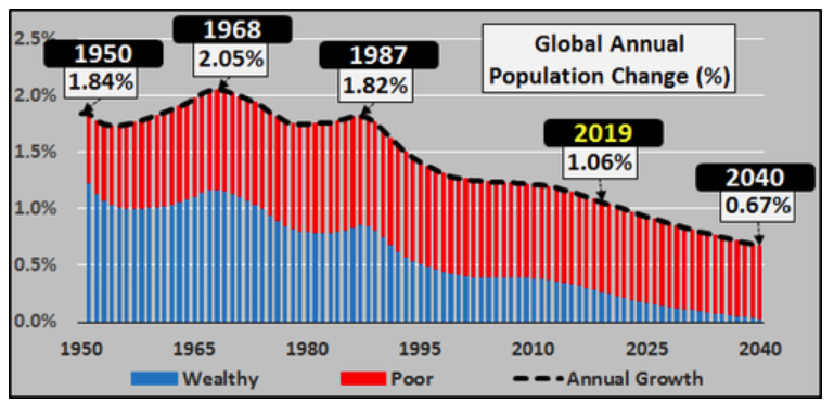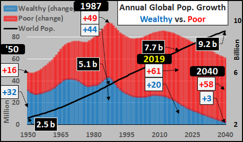 Сегодня прочитал интересную статью на зерохедже общий её смысл в том, что в 2019 году население планеты вырастет до 7,7 млрд. человек. При этом рапределение роста численности населения не однородно по странам мира на бедные страны придётся 61 млн. годового прироста из 81 миллиона человек. В то же время богатые страны добавят всего 20 млн. человек к численности населения.