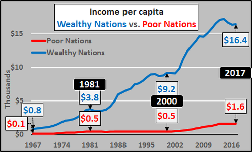 При этом если посмотреть по доходам на душу населения богатые страны в среднем в 10 раз богаче бедных: