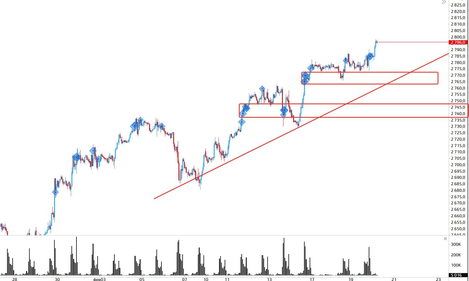 SP500 вплотную подошел к своему сопротивлению 2800, его пробой если и будет скорее всего ложный, с выносом стопов и там уже начнутся продажи, но конечно нужно смотреть и не лезть в рынок раньше чем начнут продавать, утащить могут очень высоко. На данный момент отмена приоритета и продажи ниже 2760 как минимум, закрытие ниже и ослабление покупок.