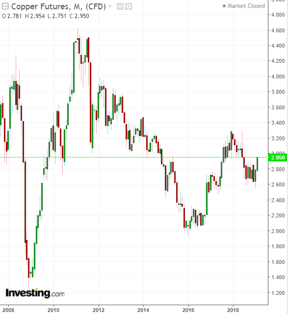 Все знают, что падение цены на медь является первым признаком надвигающейся рецессии. И цена на медь действительно снижалась... в начале прошлого года. Сейчас же она ведет себя следующим образом: