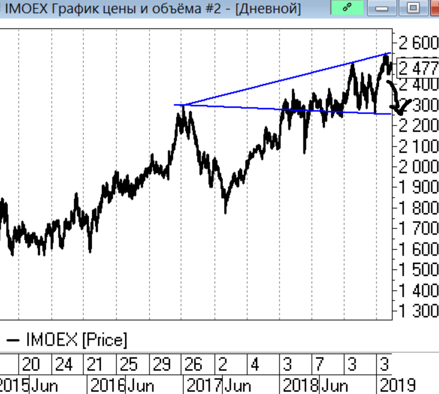 2. ММВБ - рисунок из предыдущего поста приводить не буду, ничего не поменялось цели всё ещё находятся в районе 2300, исходя из этого преобладающая тенденция пока вниз:
