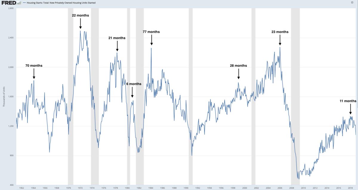 Сейчас мы посмотрим на картинку на которой отмечены хаи по строительству новых домов и цифрой отмечено через какое время после этого начиналась очередная рецессия:
